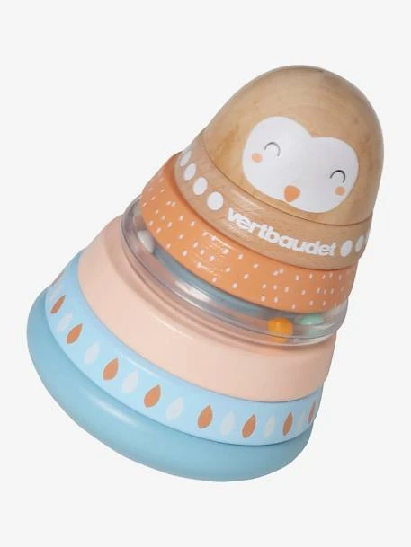 - 6 niveaux : 1 cercle bleu ciel en bois avec dessins, 1 cercle en bois uni de couleur rosée, 1 anneau transparent avec billes de couleurs + petit cercle en bois à glisser à l’intérieur, 1 cercle en bois orange avec imprimé petits points blancs, 1 cercle couleur bois avec imprimé , 1 embout en bois arrondi pour fermer le culbuto avec imprimé tête de hibou