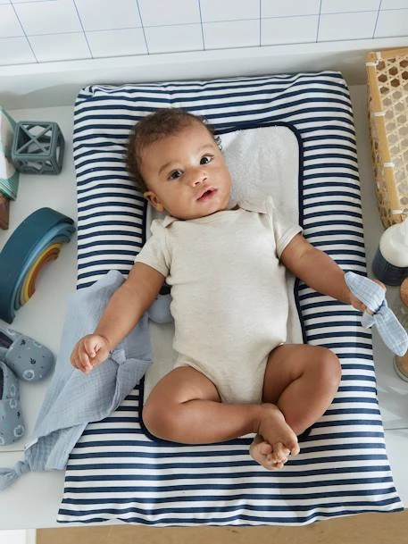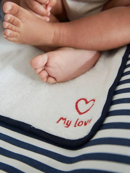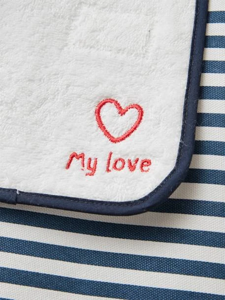 Un matelas à langer bien moelleux et rempli de tendresse pour le change de votre bébé. Sa rayure marine indémodable et son petit message « my love » brodé sur la serviette promettent un change tout en douceur.