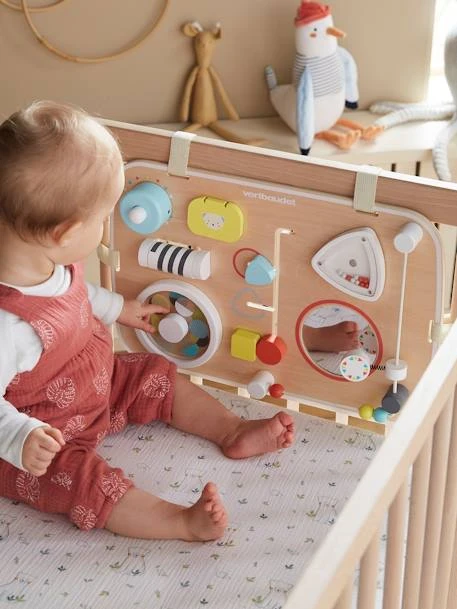 Un joli panneau facile à poser ou à accrocher sur le bord du parc ou du lit, qui éveillera les sens et la curiosité de bébé avec ses nombreuses activités ! Un miroir pour découvrir son reflet, un labyrinthe des formes, un rouleau rigolo et bien d’autres surprises que les enfants prendront plaisir à découvrir !
