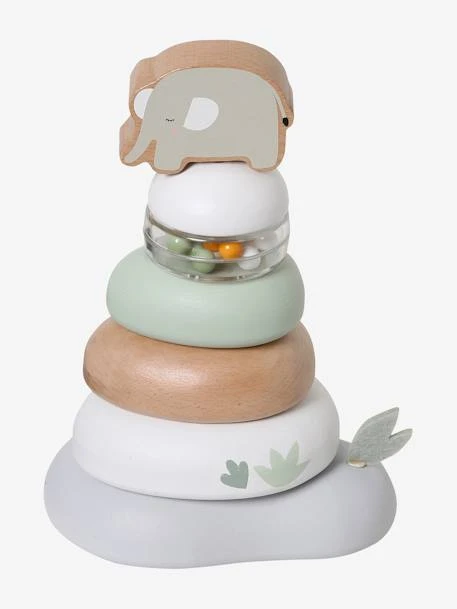 - 6 pièces à empiler : 4 de couleurs dont 1 couleur bois, 1 transparente avec billes multicolores et 1 pièce forme animal (Eléphant ou Koala)