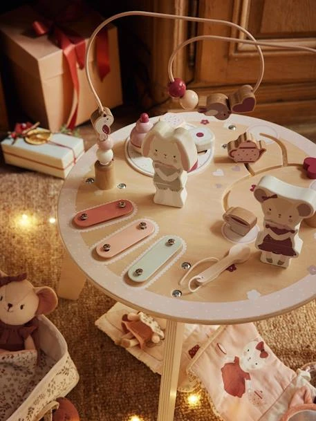 Une jolie table remplie d’activités d’éveil toutes aussi adorables les unes que les autres pour stimuler les sens de bébé. Boulier, formes à encastrer, personnages à empiler… toutes ces découvertes racontent l’histoire d’une petite souris et d’un lapin à l’heure du thé !